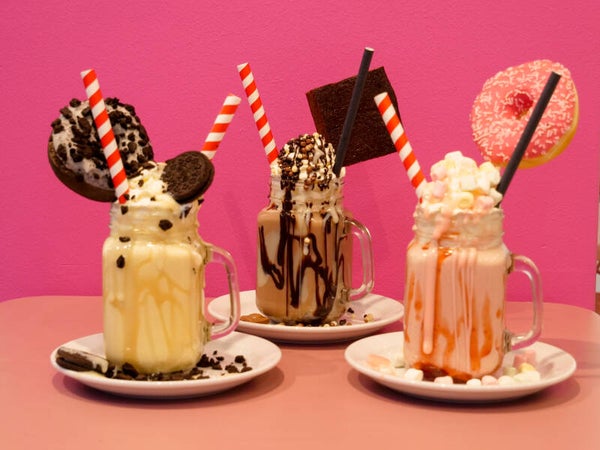 Verse chocolademilkshake met een brownie, slagroom, chocolade schilfers, chocoladesaus en witte chocoladesaus.