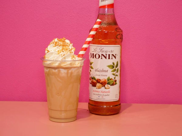 IJskoffie met hazelnootsiroop en hazelnootsaus afgetopt met krokante nootjesdip